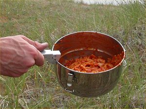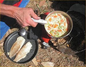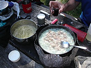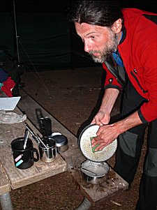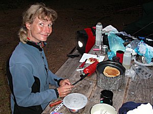 Und immer wieder PfannkuchenDa wir meistens mittags groß kochen, machen wir uns abends nur einfache Snacks. Hier gab es amerikanisch Pfannkuchen zum Abendbrot: Schnell und einfach zubereitet aus pancake-powder aus dem Supermarkt, mit Marmelade bestrichen. In meine Pfannkuchen hatte ich noch eingeweichte Rosinen gesteckt. Am wichtigsten ist hier ein Kocher, der nicht zu stark heizt. Das ist zwar nicht leicht mit dem MSR-Whisperlight aber dennoch möglich. Voraussetzung ist allerdings eine ruhige Ecke, damit man ihn auch fauchen hören kann. |