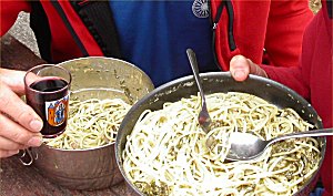 Der KlassikerNudeln haben wir immer auf Vorrat, meistens Spagetti, weil sie die beste Packungsdichte aufweisen. Das Tomatenmark schmeckt in den USA nicht ganz so gut wie in Europa, ist aber auch in praktischen, kleinen Dosen erhältlich. Mit frischen Tomaten, Zwiebeln und Gewürzen aufgepeppt, ergibt das eine leckere Sauce. Zwiebeln haben wir immer dabei und verwenden sie bei fast jedem Gericht.Hier war Markus etwas zu knausrig mit den Nudeln, dabei habe ich doch immer soooo großen Hunger! |