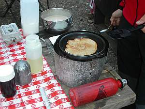 Nochmal PfannkuchenHier ist es uns zum ersten mal gelungen, auf unserem Kocher richtige "deutsche" Eierpfannkuchen zu bereiten. Mutters Rezept ist doch immer noch das beste:Mehl mit soviel Mich anrühren, bis ein cremiger Teig entsteht. Dann etwa fünf Eier pro 500g Mehl hinzurühren. Anschließend süßen und mit Milch oder Mehl so flüssig machen, daß der Teig in der Pfanne sofort verläuft. Ich bevorzuge es, den Teig in einem guten Ölbad zu fritieren, Mila möchte sie lieber trocken aus der Teflonpfanne. Das ist natürlich Geschmacksache. Wenn der Teig noch flüssig in der Pfanne ist dann kann man ihn mit Apfelscheiben, Kirschen oder jedem anderen einigermaßen festen Obst garnieren. (ma) |