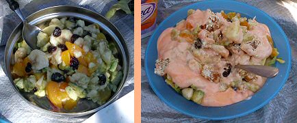 FruchtsalatEine leichte aber sehr nahrhafte Zwischenmalzeit an heißen Tagen haben wir uns aus allen Früchten zusammengestellt, die gerade verfügbar waren. Oft konnten wir den Salat noch mit Avocados und Rosienen bereichern und manchmal sogar mit Joghurt anrühren. Da sind der Fantasie fast keine Grenzen gesetzt. |