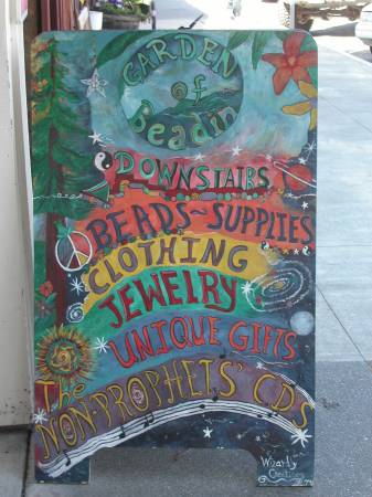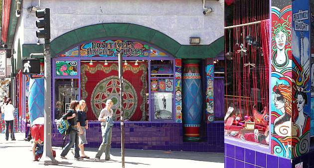Esoterikläden, bunte Cafes, alternative Buchläden und so weiter. Peacezeichen,