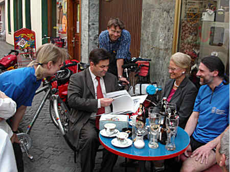 ![]() Schließlich ist sogar Klaus Herzog, der Oberbürgermeister Aschaffenburgs gekommen und hat uns mit einer Flasche Pompejaner und einem wunderschönen Buch mit Bildern von Aschaffenburgern verabschiedet. |